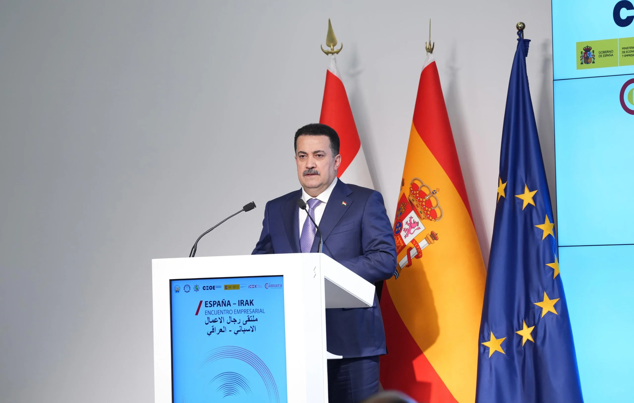 وبيّن السوداني في كلمة له خلال المنتدى أن “الوفد العراقي الكبير يمثل رسالة اهتمام جدية في التعاون الوثيق مع اسبانيا، التي تربطنا بها مواقف مهمة، خصوصاً موقفها السياسي النبيل والإنساني تجاه القضية الفلسطينية”، مشيرا الى “رغبة الحكومة في الإفادة من خبرات الشركات الاسبانية والتجارب الناجحة في مختلف القطاعات”.