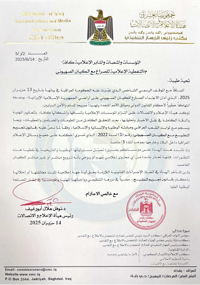 رئيس هيأة الإعلام والاتصالات د.نوفل أبو رغيف يصدر اعماماً عاجلاً وملزماً حول التغطية الإعلامية للصراع مع الكيان الصهيوني ويحذر من خرق الثوابت الوطنية ويشير الى قانون تجريم التطبيع .