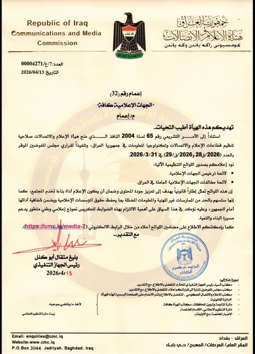 وفي هذا السياق، تلقت وكالة الوسق الإخبارية نسخة من التعميم الصادر، حيث أكدت اطلاعها على مضمونه، والعمل بموجبه وفق الأطر القانونية والمهنية، بما ينسجم مع توجيهات هيئة الإعلام والاتصالات ويعزز من دورها في نقل الخبر بمصداقية وشفافية.