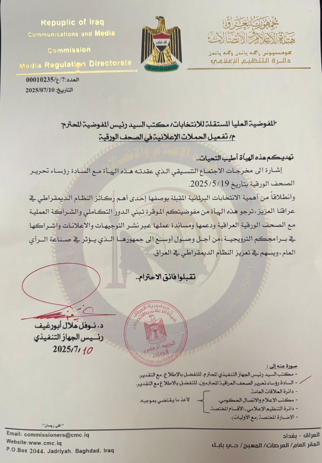 رئيس هيأة الإعلام والاتصالات مخاطباً المفوضية العليا للانتخابات : الصحافة الورقية شريك أساسي في إنجاح الانتخابات.