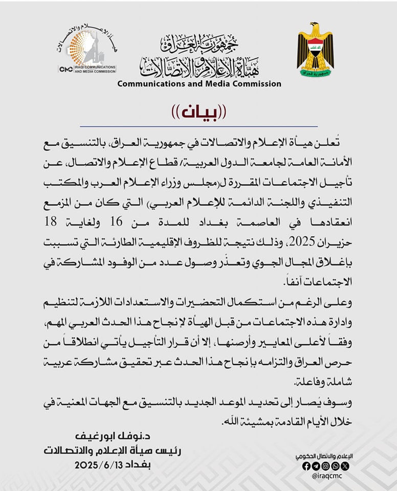 رئيس هيأة الإعلام والاتصالات يعلن تأجيل اجتماعات مجلس وزراء الإعلام العرب