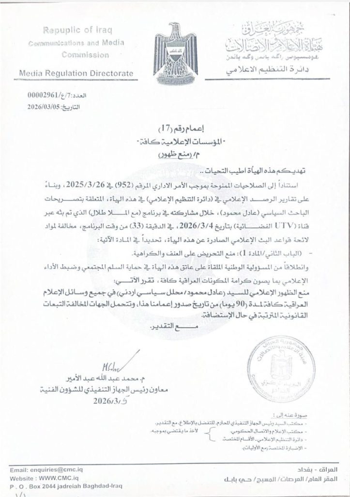 هيئة الاعلام والاتصالات تقرر منع الظهور الإعلامي للمحلل السياسي الأردني (عادل محمود) في جميع وسائل الاعلام العراقية لمدة 90 يوماً اعتباراً من تاريخ صدور هذا الكتاب .