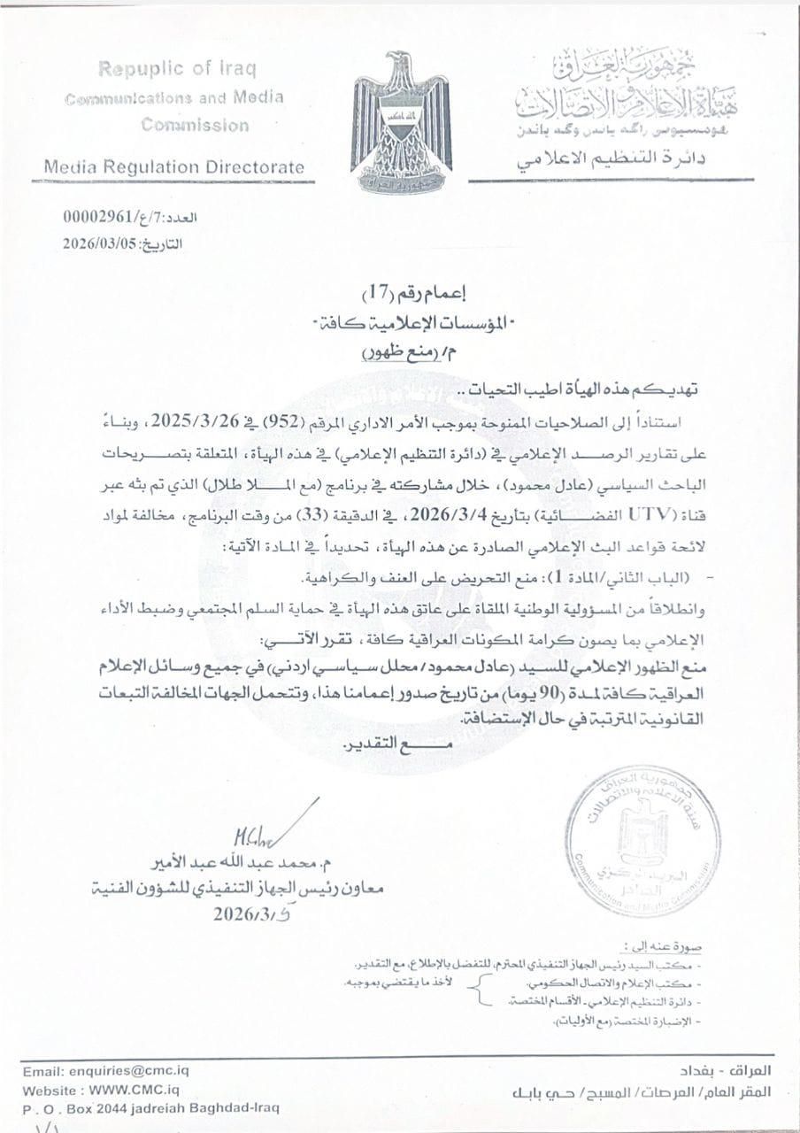 محلي هيئة الاعلام والاتصالات تقرر منع الظهور الإعلامي للمحلل السياسي الأردني (عادل محمود) في جميع وسائل الاعلام العراقية لمدة 90 يوماً اعتباراً من تاريخ صدور هذا الكتاب . March 21, 2026