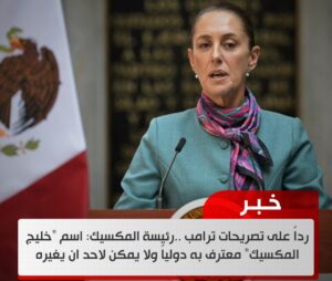 رداً على تصريحات ترامب رئيسة المكسيك اسم خليج المكسيك معترف به دولياً ولا يمكن لاحد ان يغيره January 8, 2025 التفاصيل