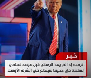 ترمب إذا لم يعد الرهائن قبل موعد تسلمي السلطة فإن جحيما سيندلع في الشرق الأوسط January 7, 2025 التفاصيل