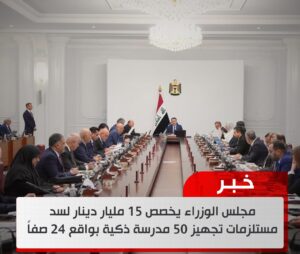مجلس الوزراء يخصص 15 مليار دينار لسد مستلزمات تجهيز 50 مدرسة ذكية بواقع 24 صفاً January 7, 2025 التفاصيل