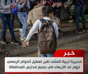 مديرية تربية المثنى تقرر تعطيل الدوام الرسمي ليوم غد الاربعاء في جميع مدارس المحافظة January 7, 2025 التفاصيل