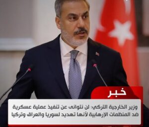 وزير الخارجية التركي لن نتوانى عن تنفيذ عملية عسكرية ضد المنظمات الإرهابية لأنها تهديد لسوريا والعراق وتركيا January 7, 2025 التفاصيل