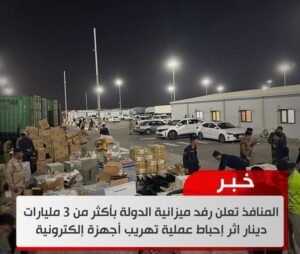 المنافذ تعلن رفد ميزانية الدولة بأكثر من 3 مليارات دينار اثر إحباط عملية تهريب أجهزة إلكترونية January 7, 2025 التفاصيل