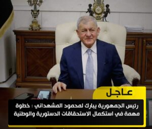 رئيس الجمهورية يبارك لمحمود المشهداني خطوة مهمة في استكمال الاستحقاقات الدستورية والوطنية October 31, 2024 التفاصيل