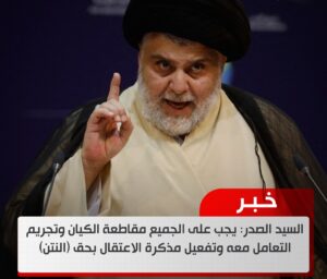 السيد الصدر: يجب على الجميع مقاطعة الكيان وتجريم التعامل معه وتفعيل مذكرة الاعتقال بحق (النتن) October 26, 2024 التفاصيل