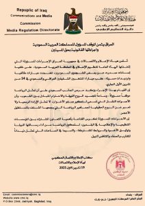 العراق يثمن الموقف المسؤول من المملكة العربية السعودية وإجراءاتها القانونية بحق المسيئين October 19, 2025 التفاصيل