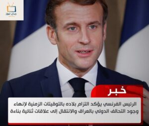 الرئيس الفرنسي يؤكد التزام بلاده بالتوقيتات الزمنية لإنهاء وجود التحالف الدولي بالعراق والانتقال إلى علاقات ثنائية بناءة October 13, 2024 التفاصيل